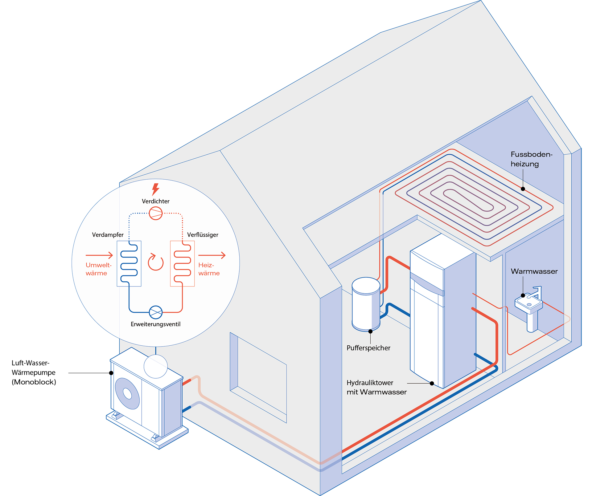 Wärmepumpen nutzen die Energie, die in der Luft, im Wasser oder im Erdreich gespeichert ist. Diese Wärme wird über ein Kältemittel aufgenommen und verdichtet, um eine höhere Temperatur zu erzeugen, die sich zum Heizen von Wohnräumen und zur Warmwasserbereitung eignet.